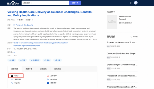 在内容方面,Wiley与百度学术达成题录合作,相关数据正逐步接入百度学术平台,合作资源的原文链接将在文献详情页链接头部位置展现,进一步为科研学者群体提供快速、高效获取国际优质专业内容的有效渠道,扩大学术科研成果的辐射范围。